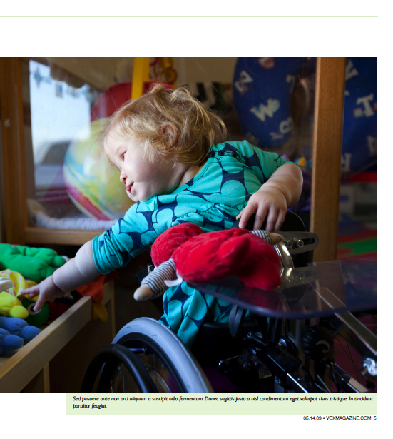 Here is the second spread. This is the page that looks at Ryleigh's disorder a little closer. It shows the characteristic turned-in feet of spina bifida, as well as Ryleigh's struggle to reach for things from her wheelchair.